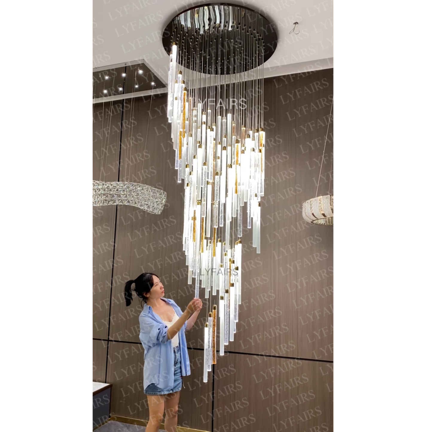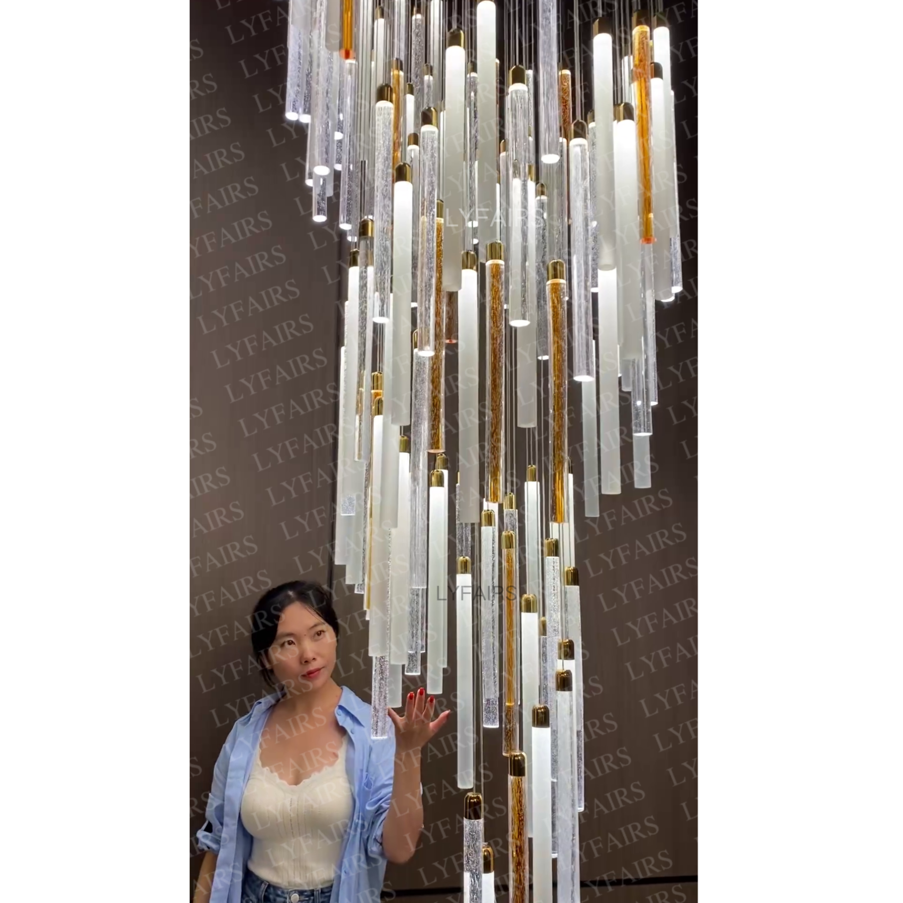 Modern Floating Clear&Orange Cylindrical Crystal Chandelier for High-ceiling